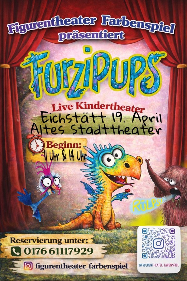 Der kleine Drache Furzipups hat ein besonderes Problem: Immer wenn er Feuer spucken will, knattert es nur laut! Gemeinsam mit seinen Freunden Hicksi Huhn und Rüdiger Rülpsrüssel erlebt er ein lustiges Abenteuer voller Pannen, Lachen und Mitmachmomenten für die kleinen Zuschauer.